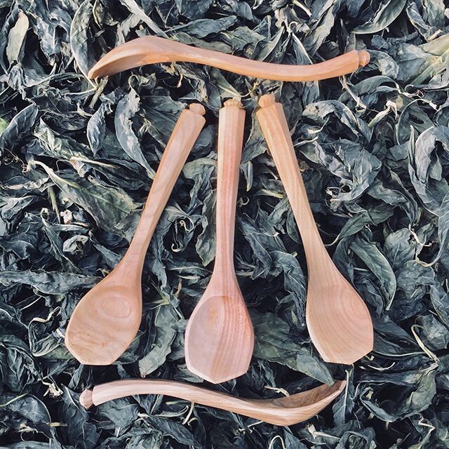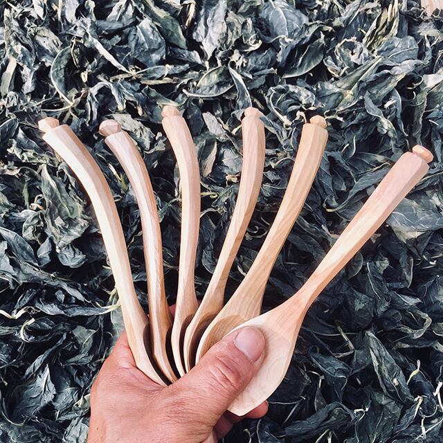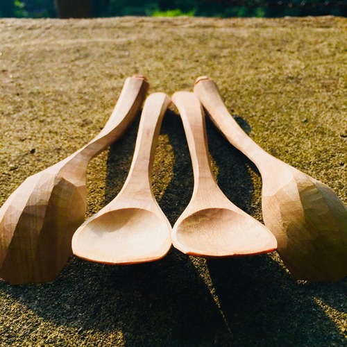 工房樹音の商品は、森のお手入れで出た生木を用いています。仕上げは、木の繊維を潰さないよう、やすりを使わずにナイフだけで仕上げた“ナイフフィニッシュ”で行っています。