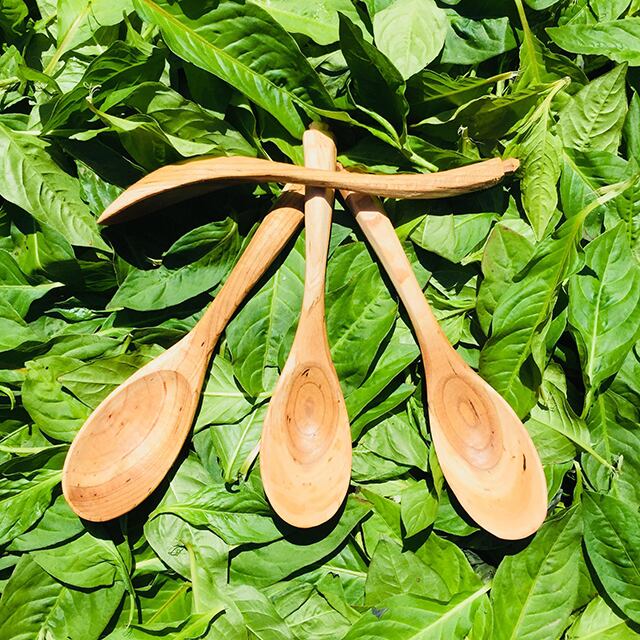 工房樹音の商品は、森のお手入れで出た生木を用いています。仕上げは、木の繊維を潰さないよう、やすりを使わずにナイフだけで仕上げた“ナイフフィニッシュ”で行っています。